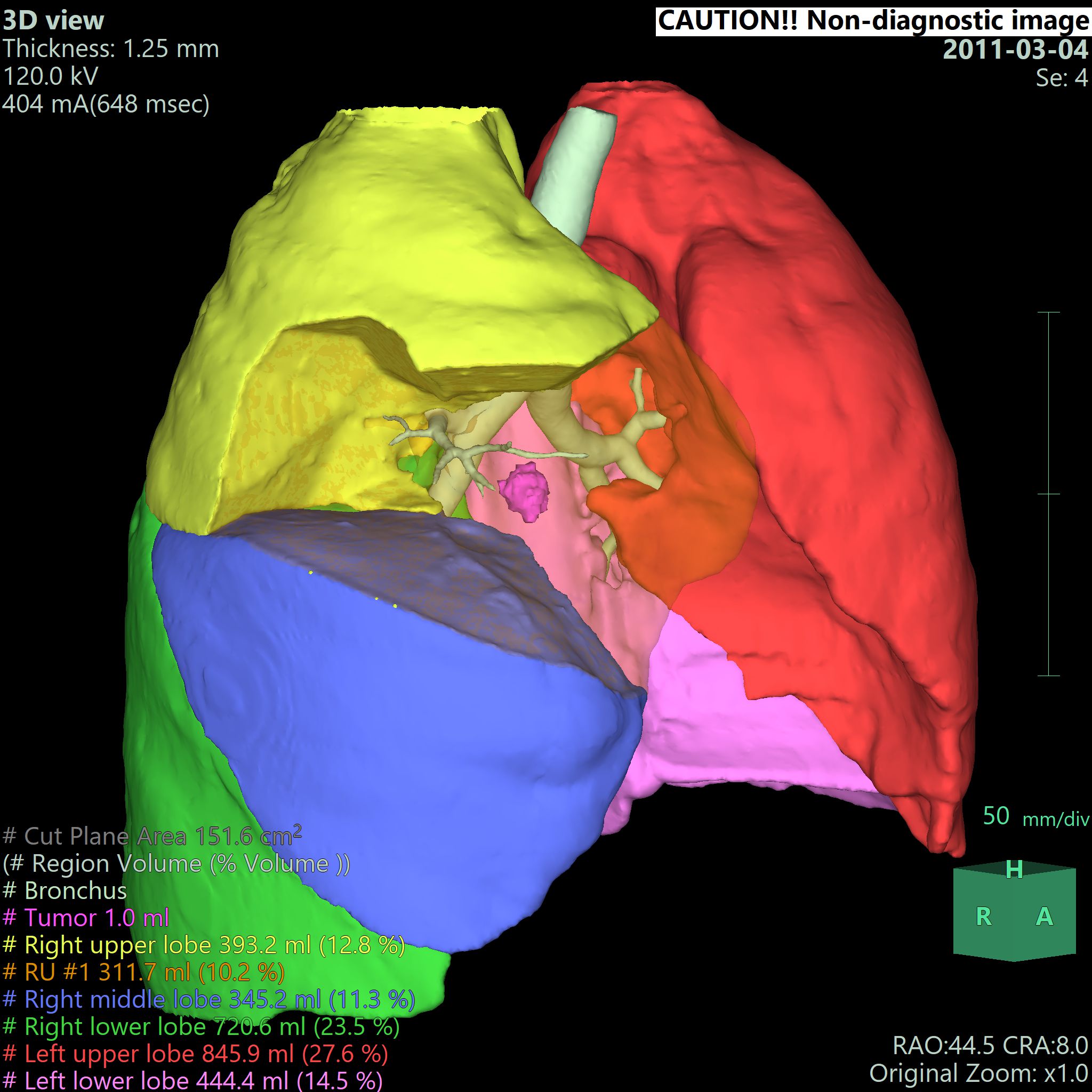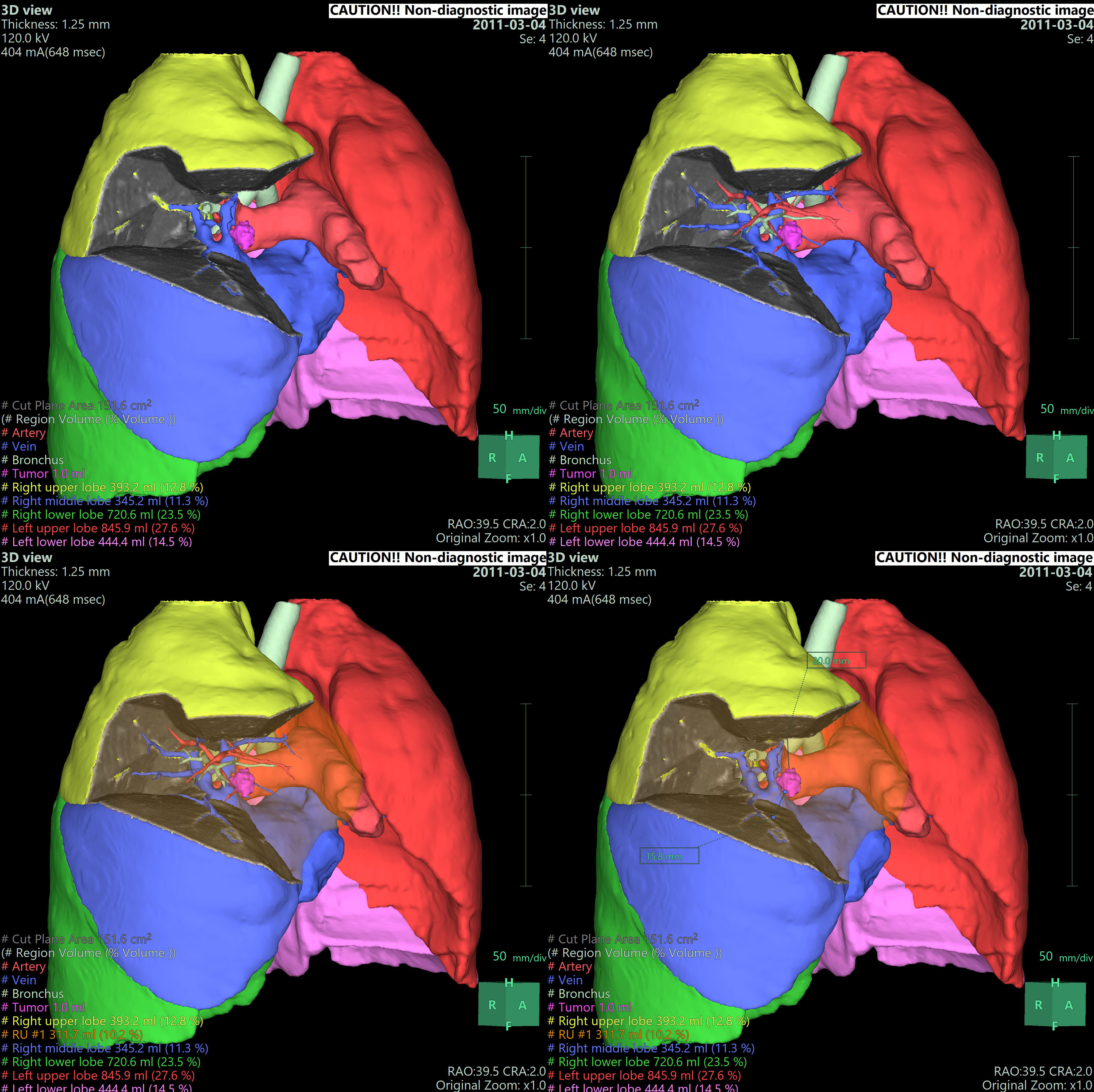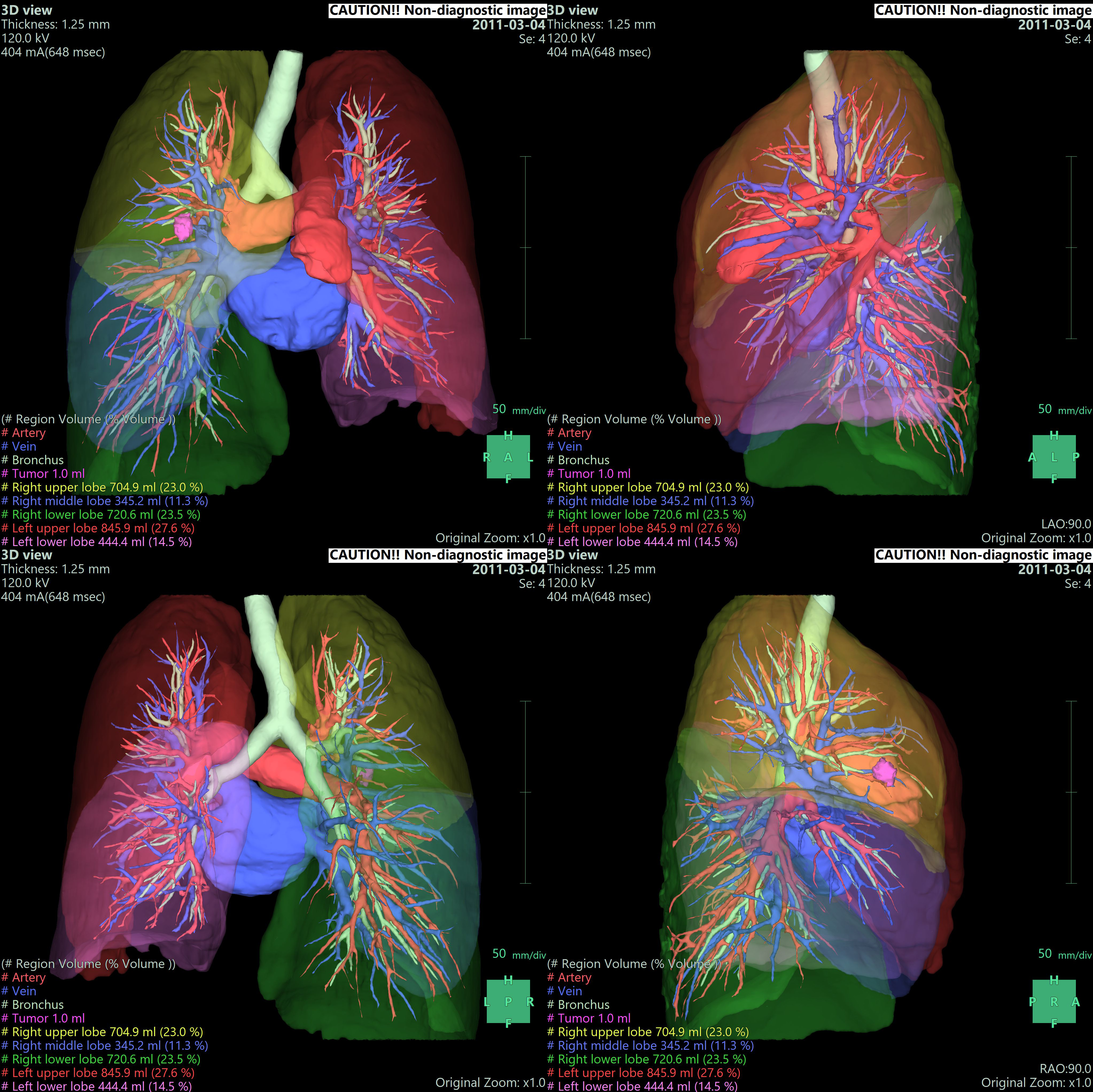 • - 조영 증강된 CT image를 사용하여 Lung, Airway, Vessel, tumor 등을 추출하고 3D로 재구성하고 결과를 관찰할 수 있습니다.
