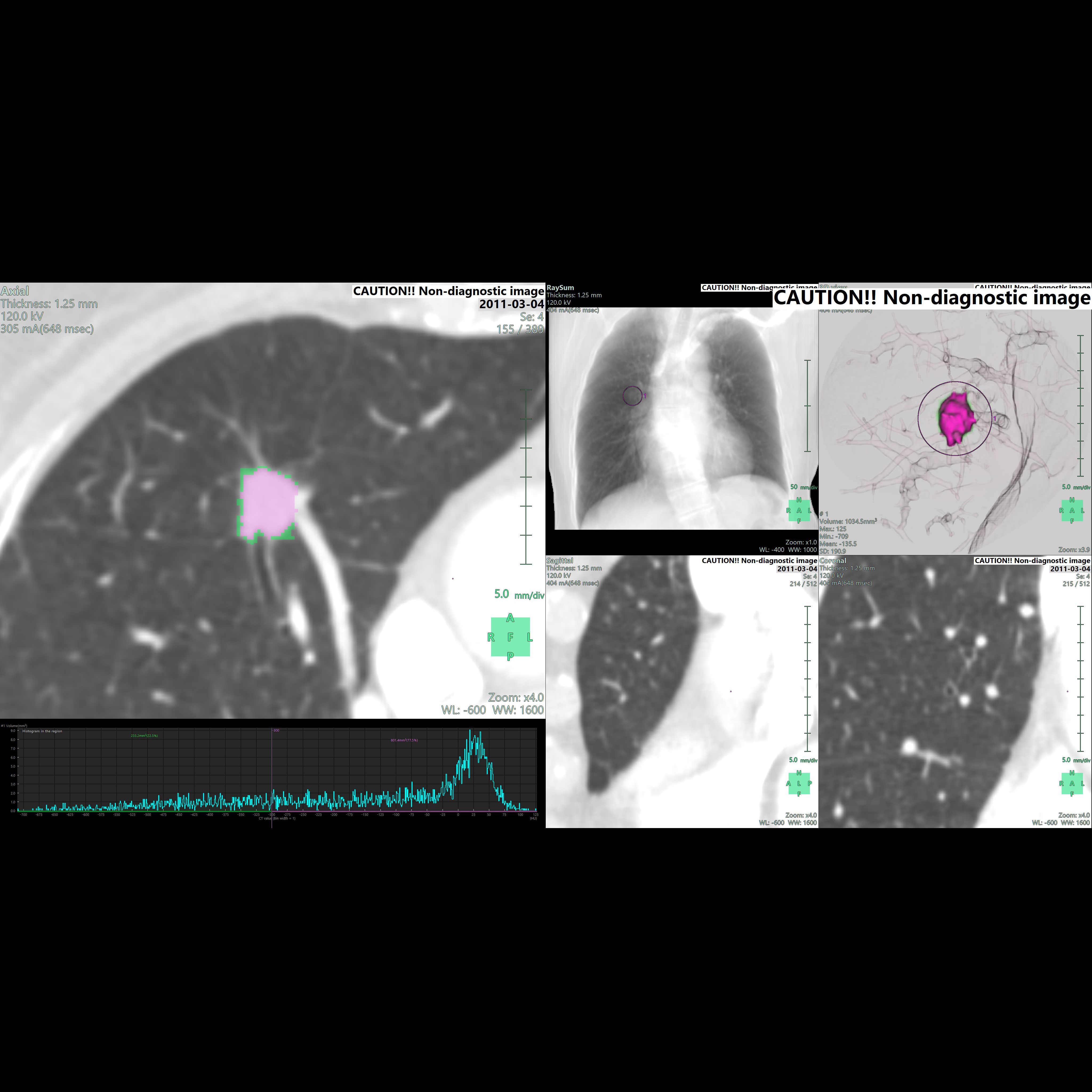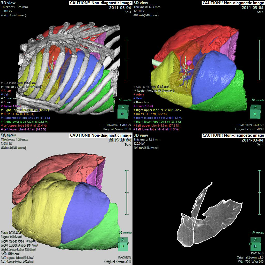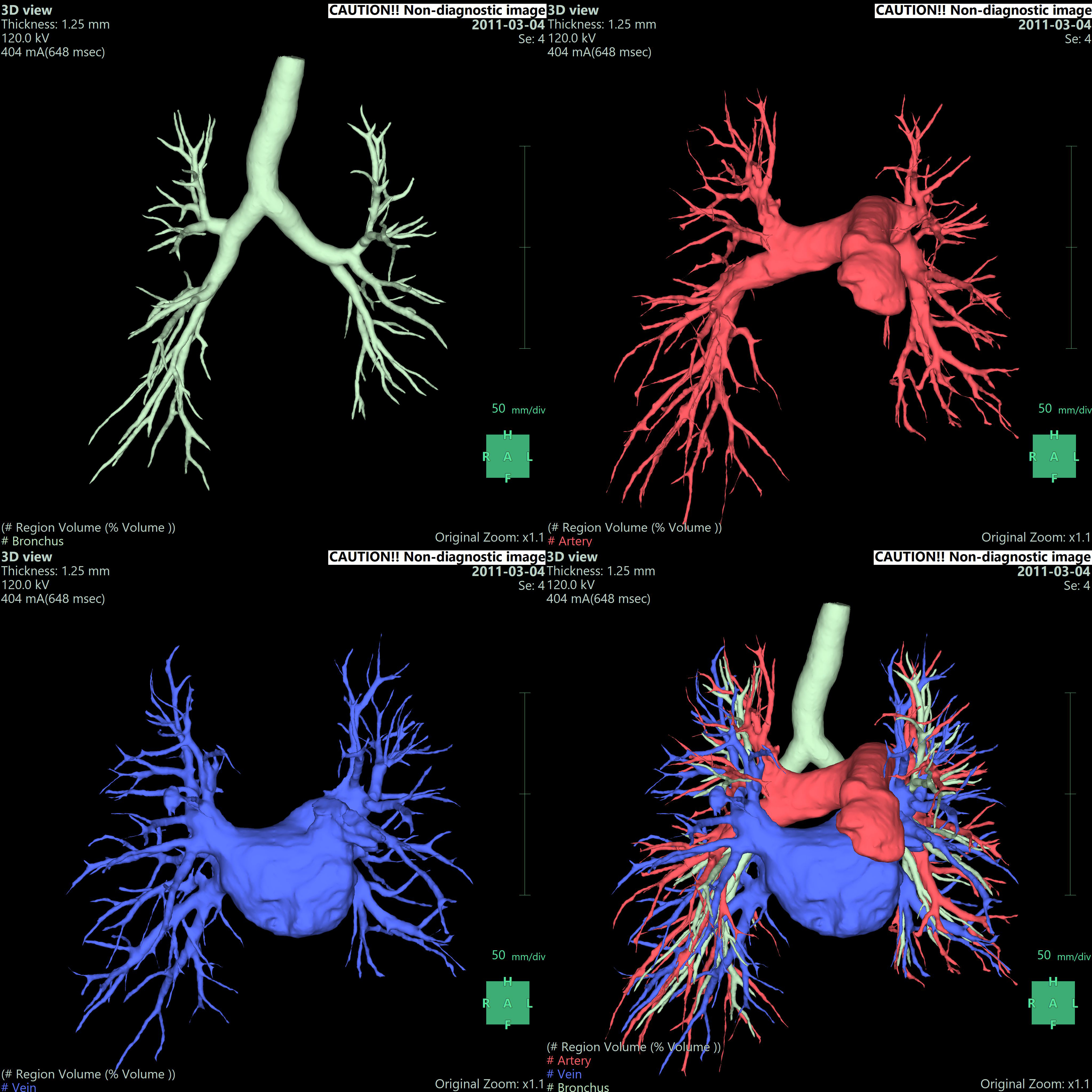 • - 조영 증강된 CT image를 사용하여 Lung, Airway, Vessel, tumor 등을 추출하고 3D로 재구성하고 결과를 관찰할 수 있습니다.